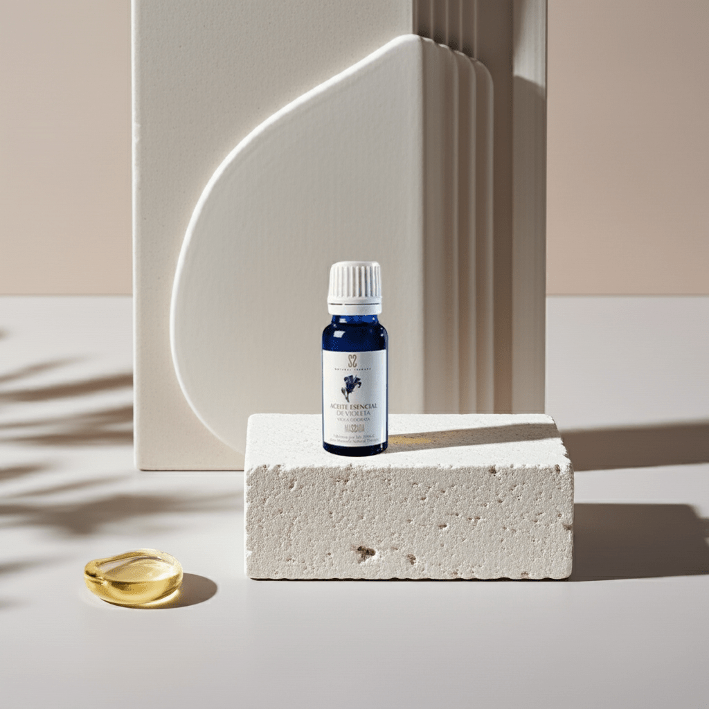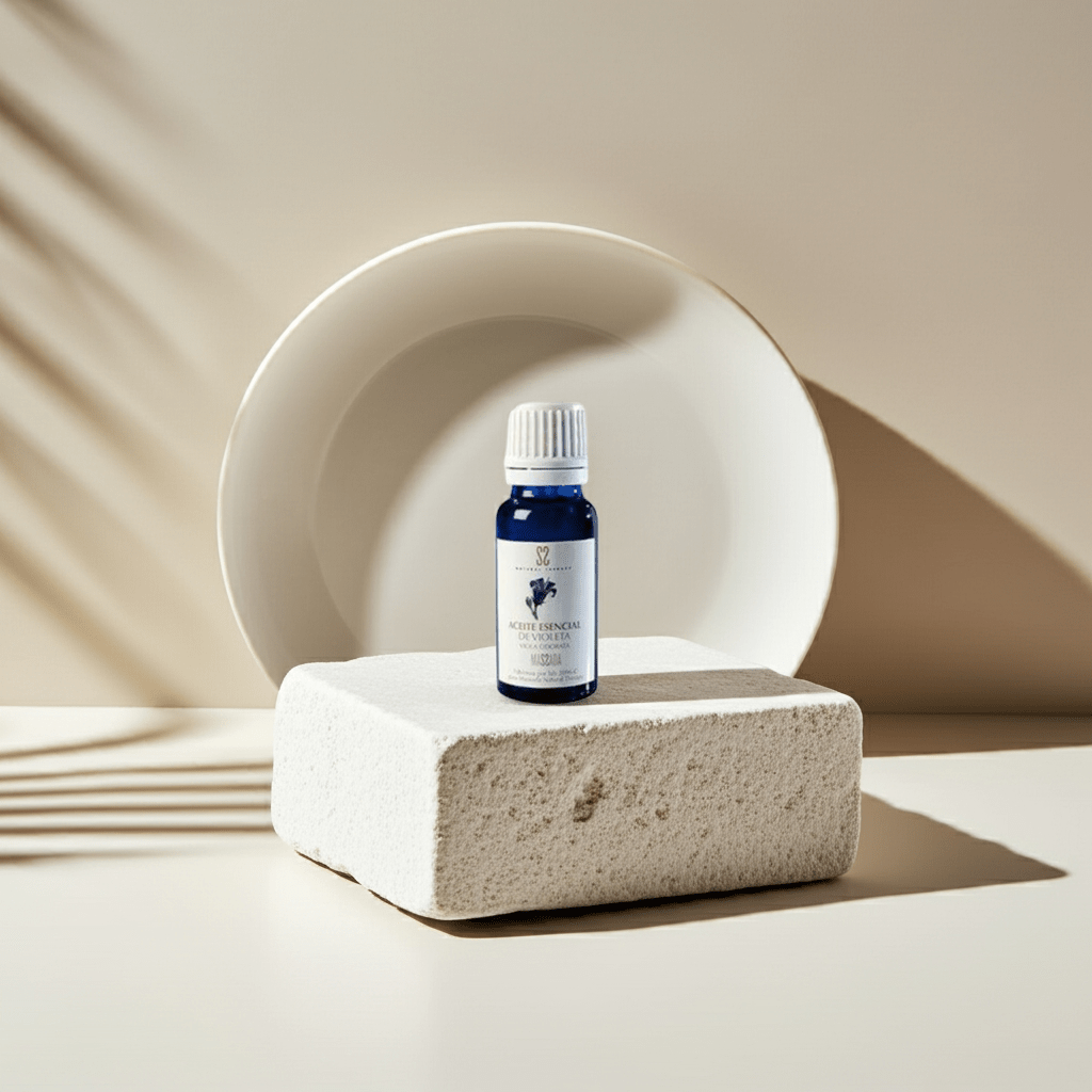 Aceite esencial de violeta natural para masaje y aromaterapia. Alivia dolores musculares, estrés, migrañas e insomnio. Ideal para pieles secas y acné.
