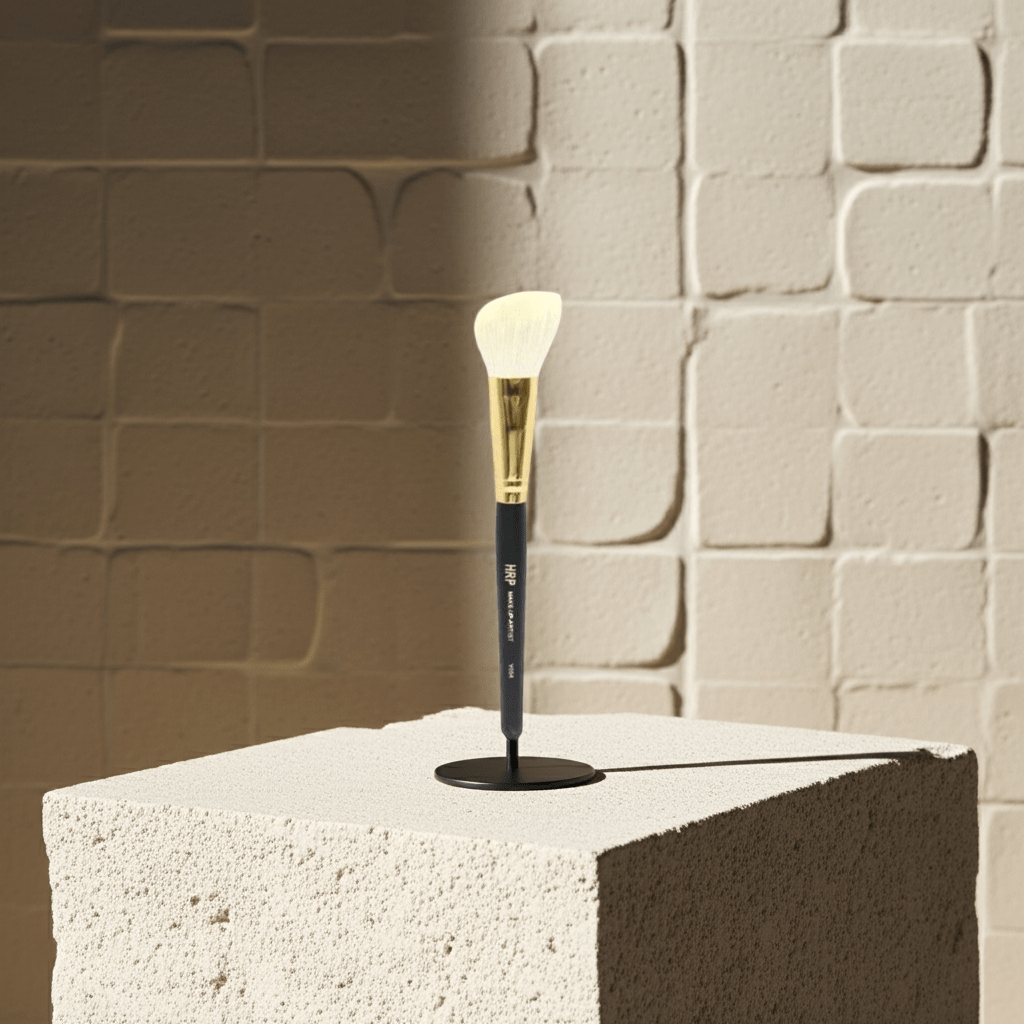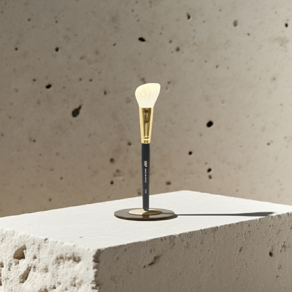 Brocha biselada profesional de pelo de cabra natural, ideal para aplicar colorete y contorno en polvo con precisión y difuminado perfecto.