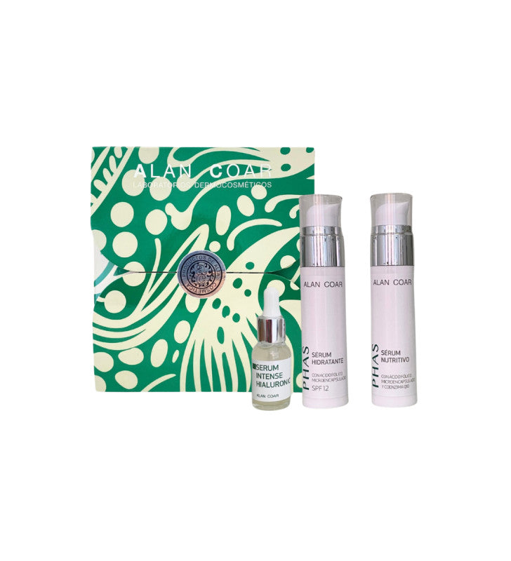 Pack con sérums hidratantes y nutritivos con ácido hialurónico y PHA's. Aporta luminosidad, firmeza e hidratación intensa para pieles sensibles.