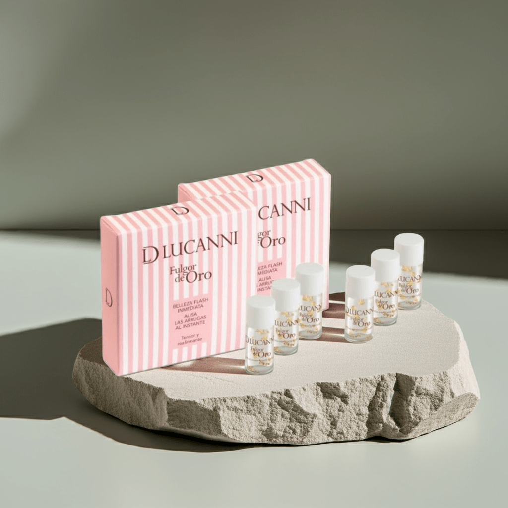 Fulgor de Oro de D'Lucann i son 3 ampollas flash con acción tensora. sus Acciones se ven de inmediato. Borra las arrugas y reafirman la piel. Además, ayuda a fijar el maquillaje posterior. Contiene partículas de oro.