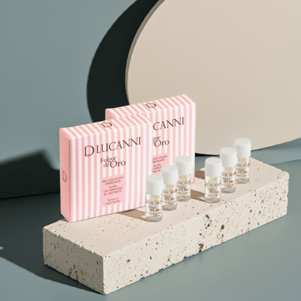 Fulgor de Oro de D'Lucanni son 3 ampollas flash con propiedades tensoras y reafirmantes. con efecto "borrador de arrugas"