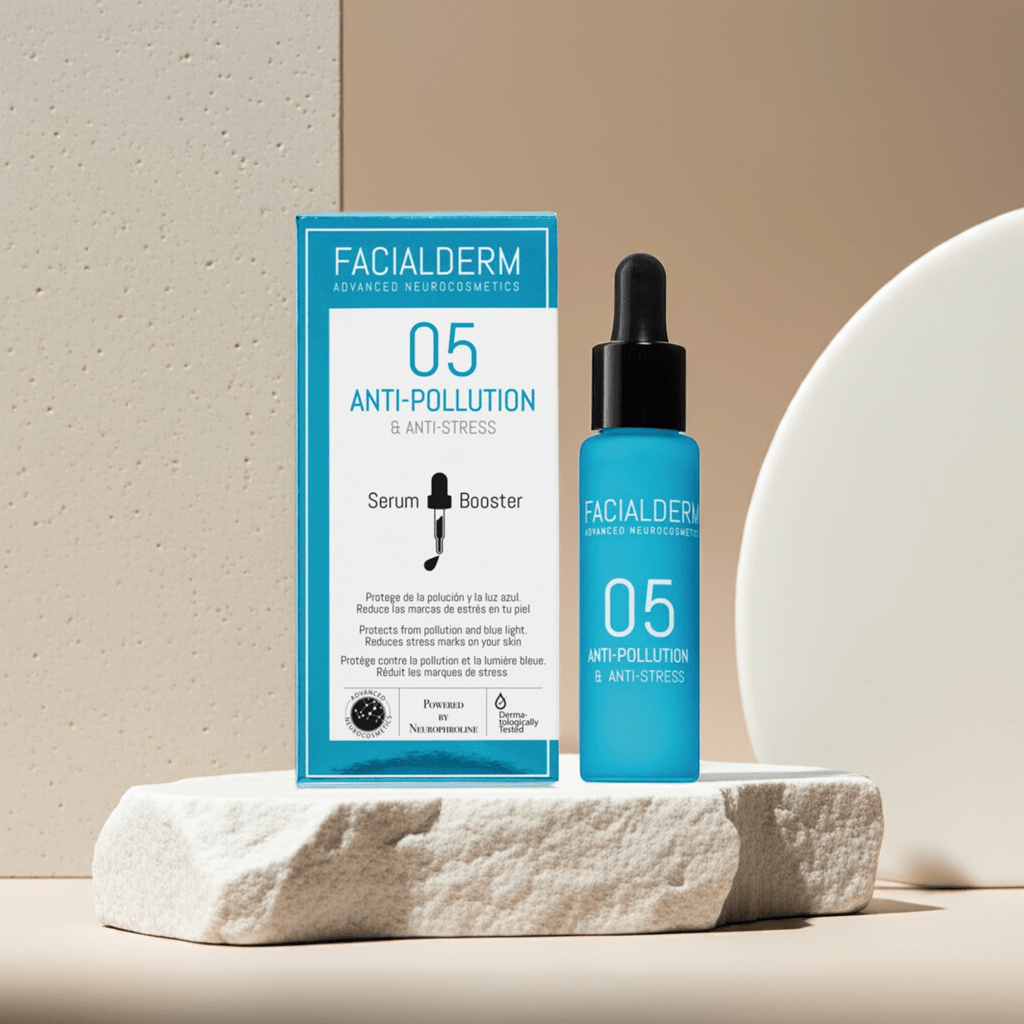 05 anti-Polución y Anti Luz Azul de Facialderm es un concentrado facial que protege la piel de la polución de la ciudad y de las luces azules de las pantallas de ordenadores y móviles. Como todos los productos de Facialderm contiene Neurophroline, que combate la hormona del estrés para aporta bienestar en el plano epiteliar y neuronal.