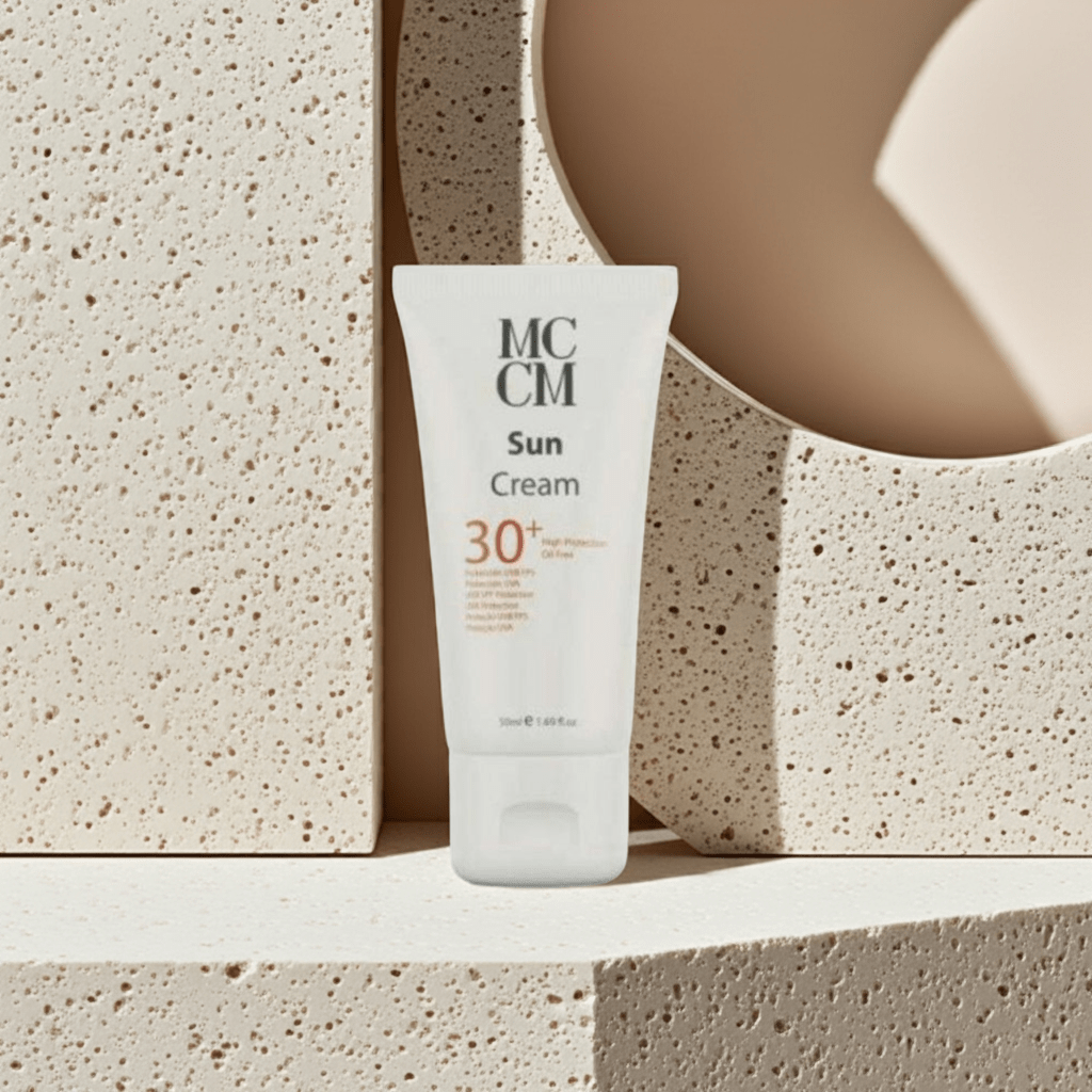 Sun Cream SPF30+ de MCCM es un protector solar facial con protección media-alta que hidrata y protege la piel de los efectos nocivos de la piel. Es una formula resistente al agua . Apta para las pieles más sensibles o pieles sometidas a tratamientos quirúrgicos. Con urea y alantoina que cuida, calma y suaviza la piel. Evita la aparición de eritemas solares y manchas en la piel.